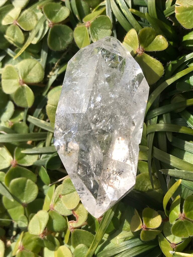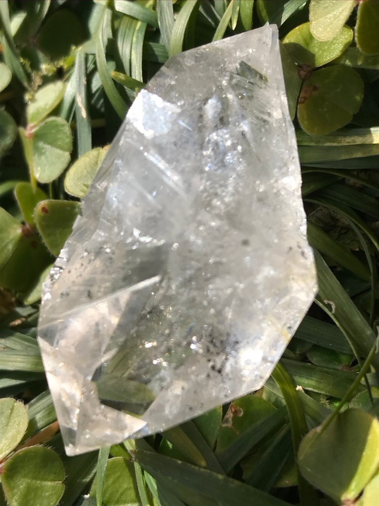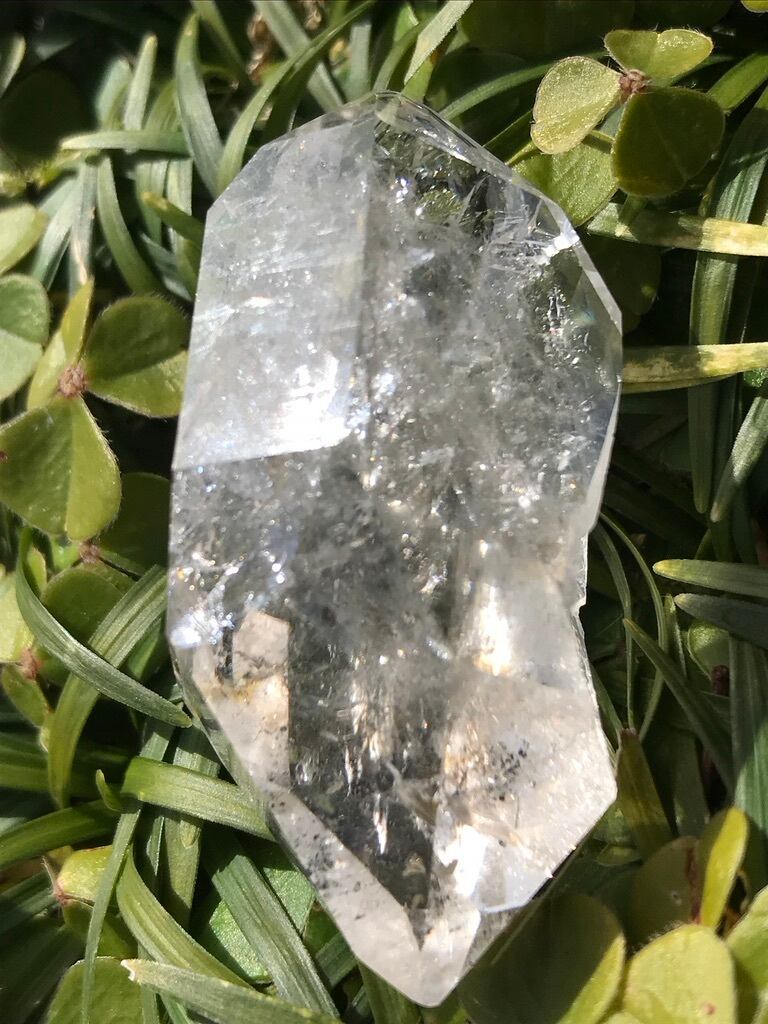 アメリカのハーキマーでのみ産出されるダブルターミネーターの水晶です。水晶の先端が両側にあるので、エネルギーも双方向に流れることと、オレンジ色のカラーエネルギーももつことから体内のエネルギーブロックを体外に排出させるヒーリング作用をもつといわれます。また明晰夢をサポートすることからドリームクォーツの別名をもちます。磨きがされていないのにも拘らず、名の通り美しい表面と形、輝きをもつクリスタルです。透明度が高いのですが、中のクラックが反射してレインボーも見られます。こんなに大きなハーキマーダイヤモンドの原石は希少です。