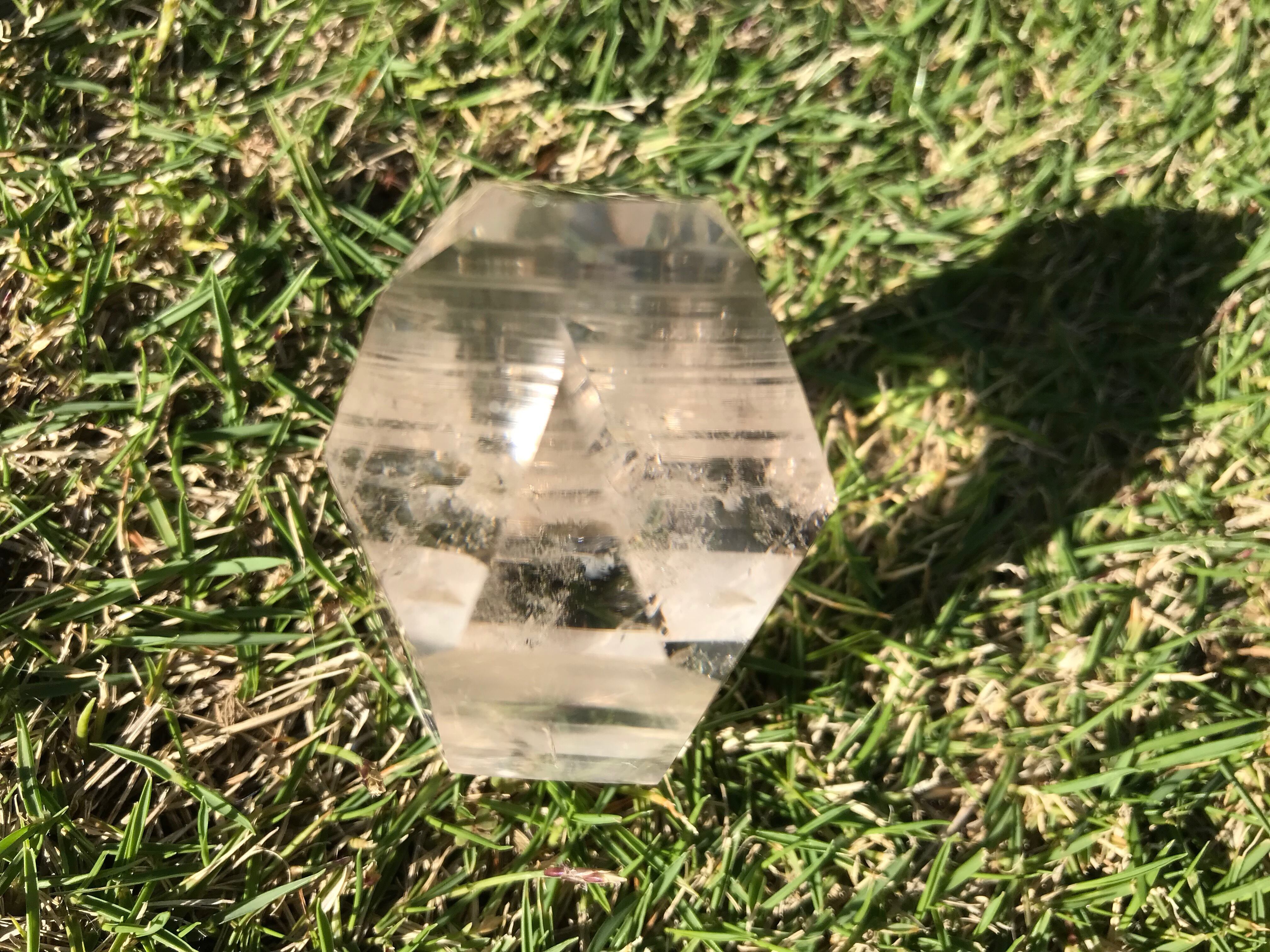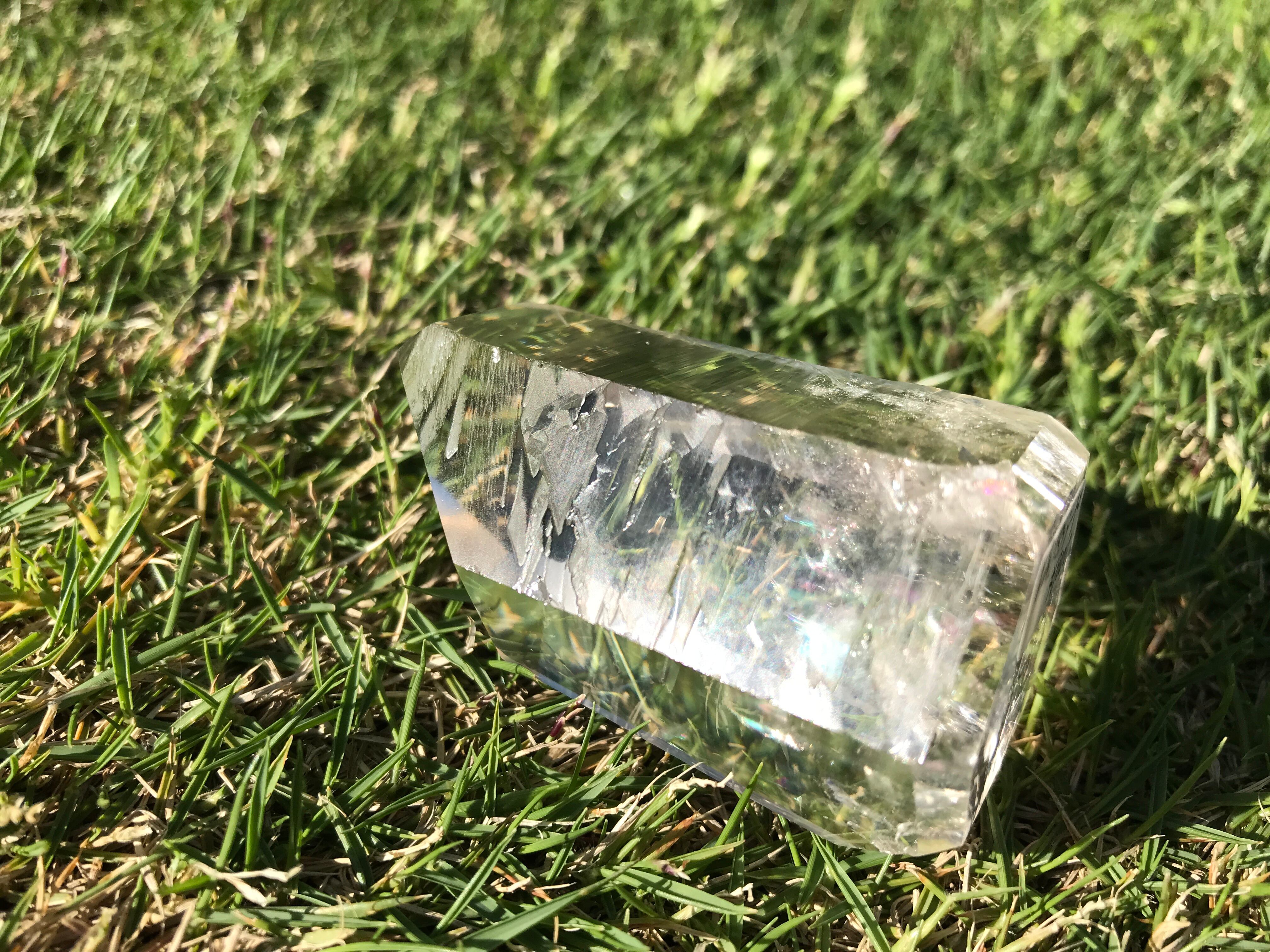 非常に透明度が高く、水晶内部の下方にあるクラックからは美しい虹が見られ、バランスの取れた調和を感じる水晶です。