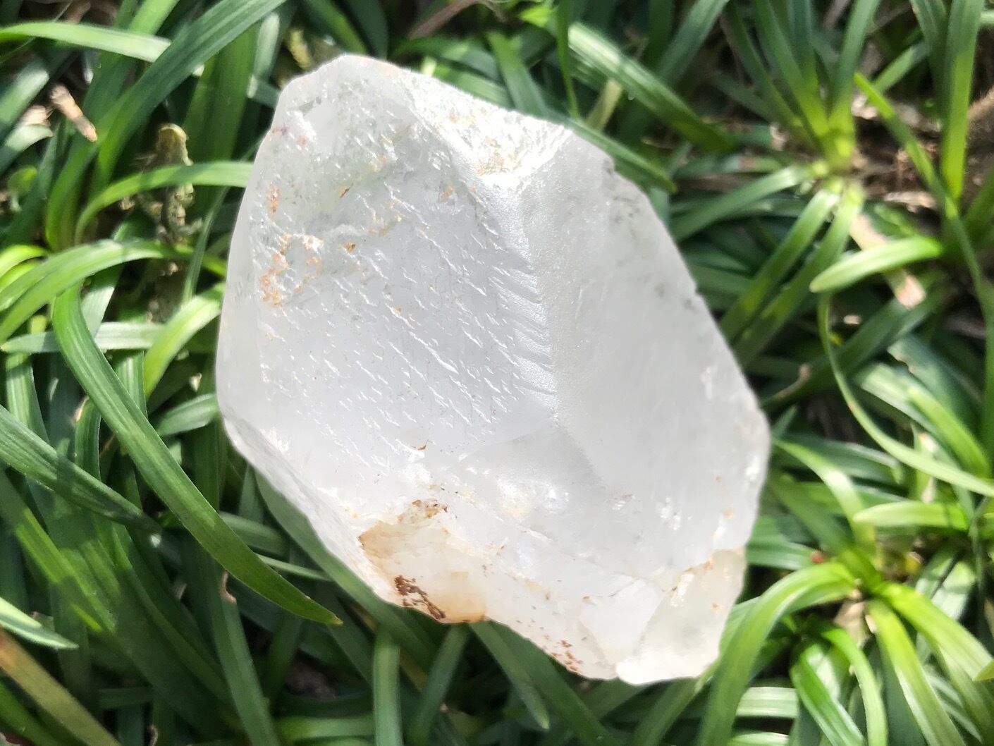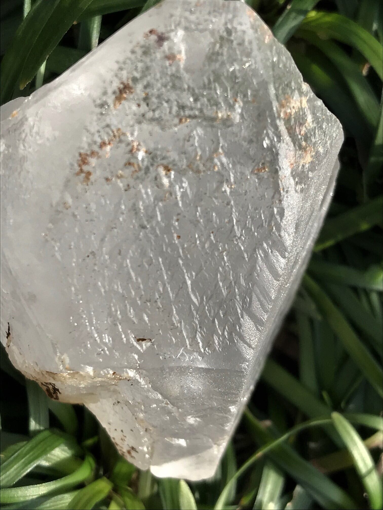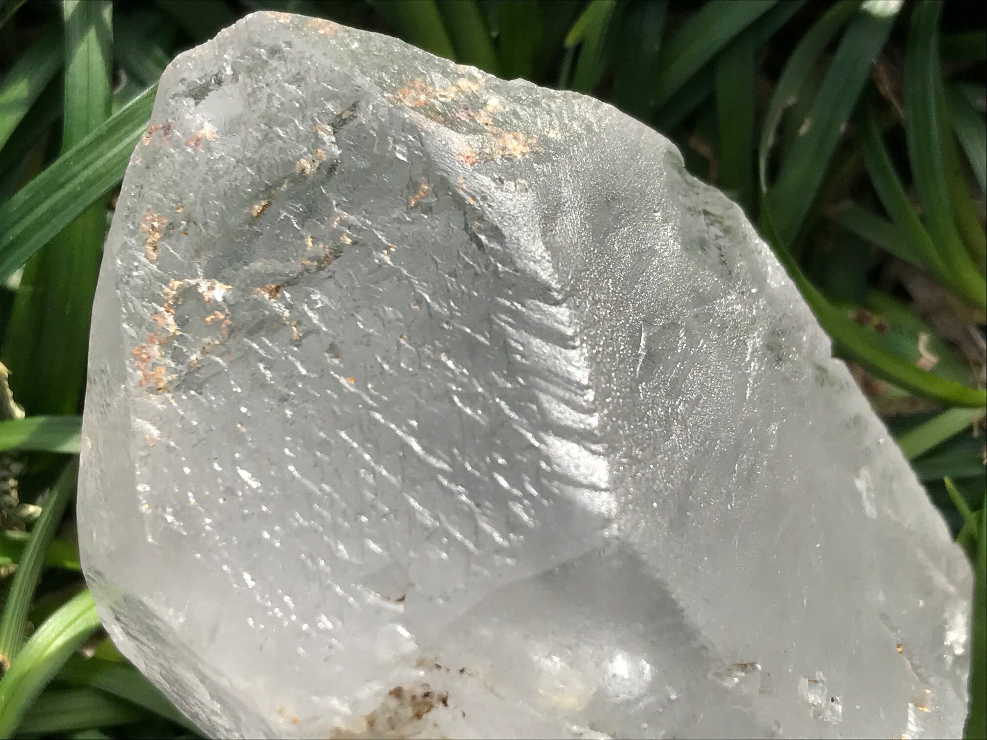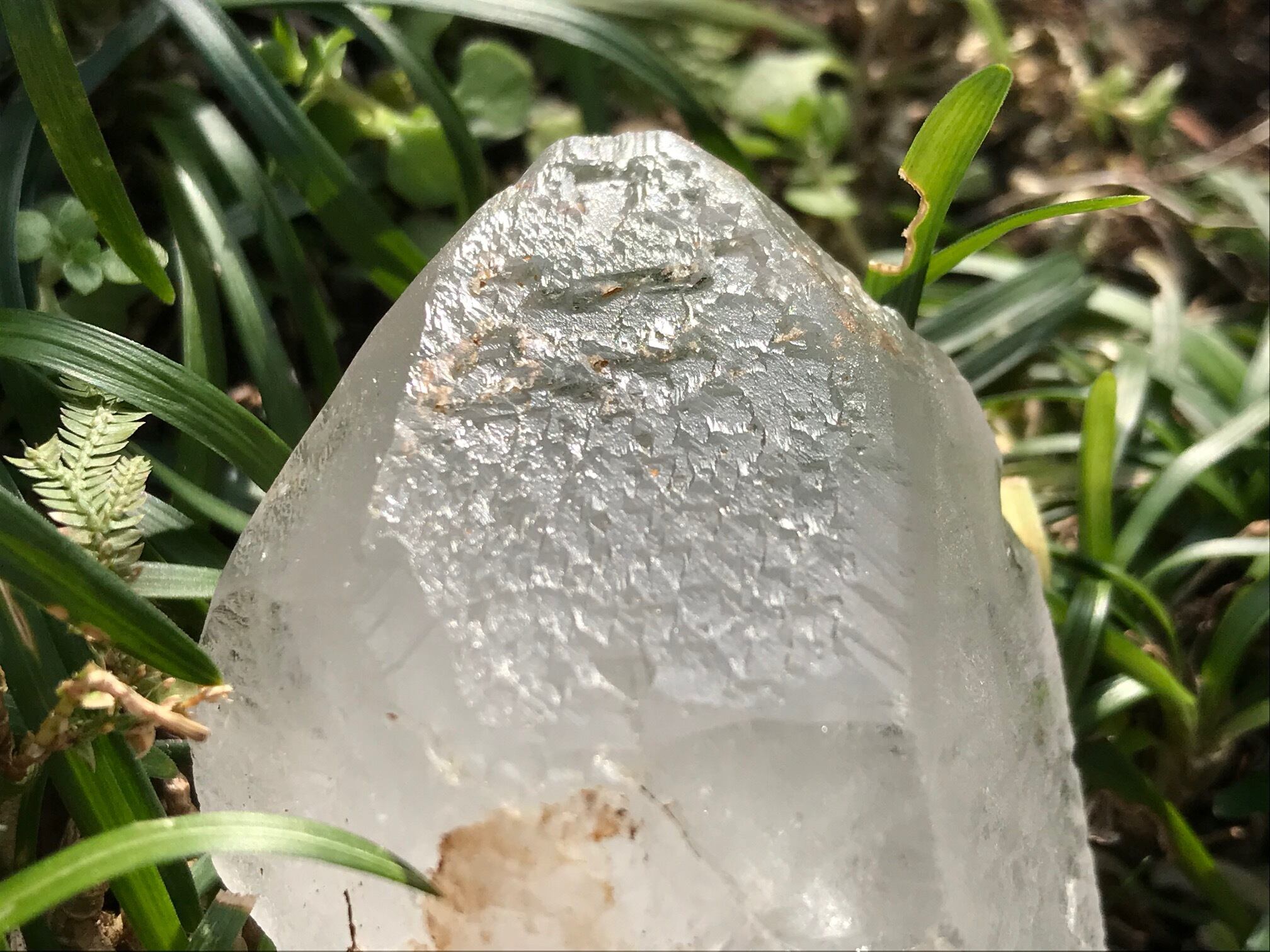 さてこちらの水晶は、ファセット2面にたくさんのトライゴー▽がびっしりと刻まれており、まるで何かの幾何学模様にも見えます。またファセット面にはほんのりクローライト(緑泥石)がインクルージョンが見られ、持ち主をマイナス感情から守り、精神と肉体のバランスと癒しをサポートしてくれるでしょう。水晶全体の形状はすり削られような柔らかい輪郭をもち、下面の剥ぎ取られた面は自己修復中のようなセルフヒーリングの様相も見られ、なかなか厳しい環境を耐え抜いた古い水晶を思わせます。